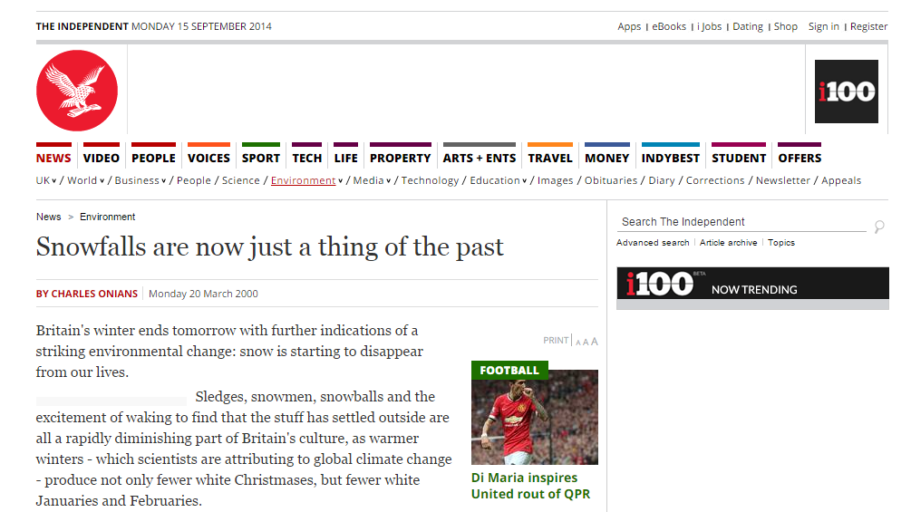 From the Independent’s most cited article: Snowfalls are now just a thing of the past by Charles Onians: